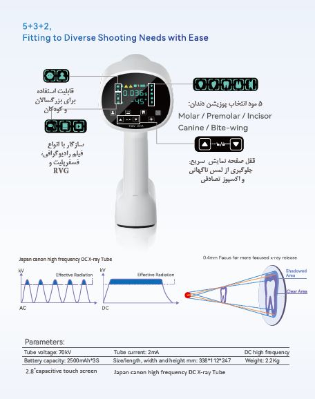 Mini Ray دارای نمایشگر LED لمسی و رابط کاربری ساده است که تنظیمات را برای دندانپزشک راحت میکند. این دستگاه با انواع سیستمهای تصویربرداری و فیلمهای اشعه ایکس سازگار بوده و برای مطبهای مدرن و کلینیکهای سیار ایدهآل است. باتری داخلی با ظرفیت مناسب و قابلیت شارژ سریع، امکان استفاده مداوم از دستگاه را فراهم میکند و فعالسازی بیسیم، راحتی و ایمنی بالایی به همراه دارد. این ویژگیها Mini Ray را به گزینهای عالی برای هر مطب دندانپزشکی تبدیل کرده است.