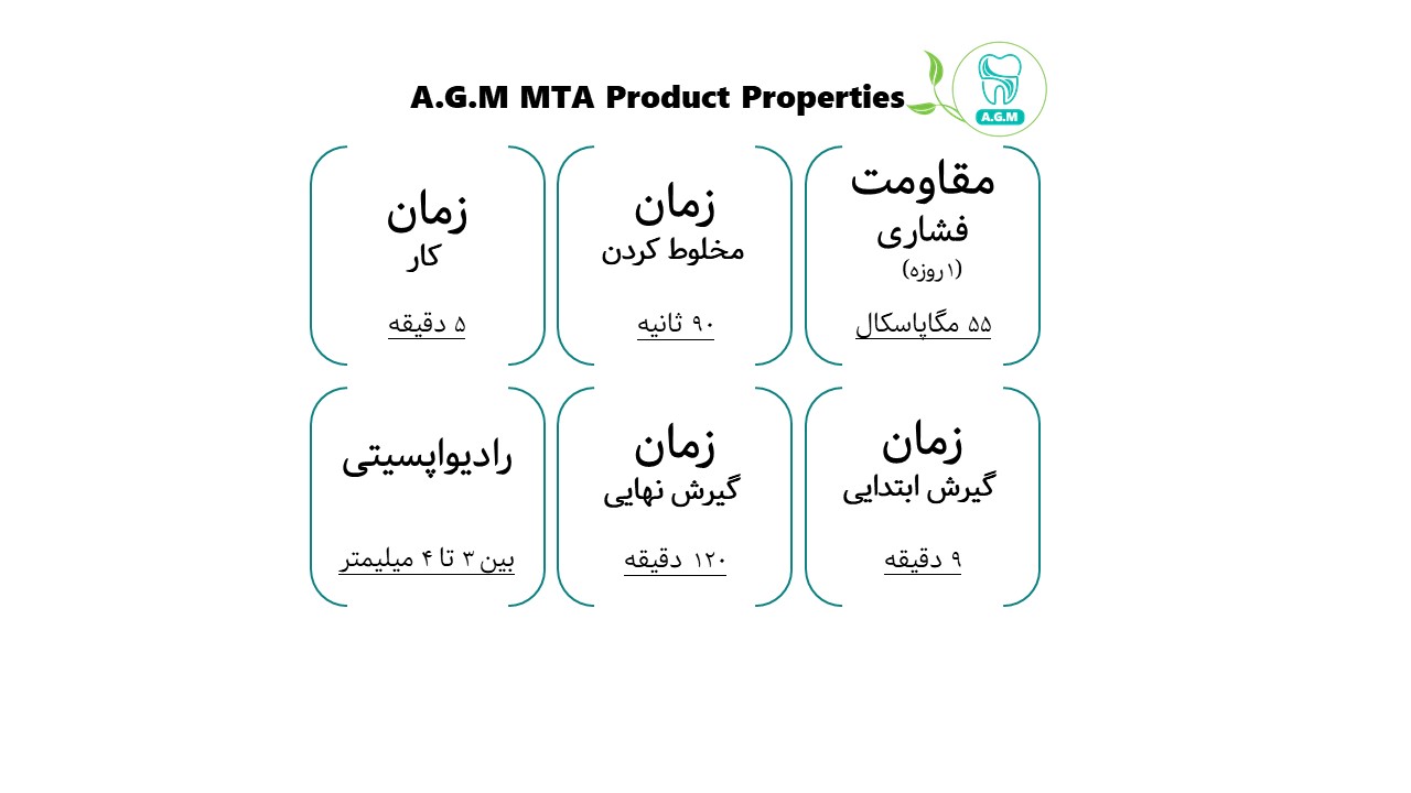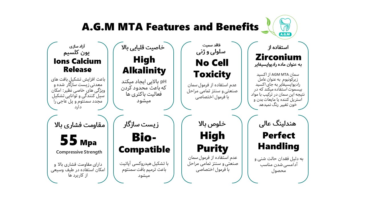 سمان MTA AGM دارای سیل عالی و رادیواپسیته بالا است که امکان مشاهده دقیق آن در تصاویر رادیوگرافی را فراهم می کند. علاوه بر این، هندلینگ آسان بدون نیاز به تجهیزات خاص، استفاده از این محصول را در مطب برای دندانپزشکان ساده و سریع کرده است. مقاومت فشاری بالا و طول عمر طولانی در محیط دندان باعث می شود ترمیم ها تا مدت طولانی عملکرد مناسب خود را حفظ کنند.