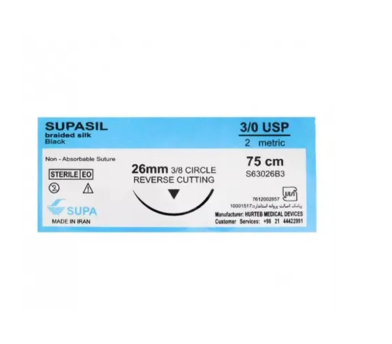 نخ بخیه سیلک سوپاسیل (غیرقابل جذب) Supasil محصولی با کیفیت ساخت ایران است که برای استفاده در جراحی های دهانی و دندانپزشکی طراحی شده است. این نخ بخیه غیرقابل جذب و مقاوم، امکان بخیه زدن دقیق و محکم را فراهم می کند و برای تثبیت بافت در طول درمان بسیار مناسب است. سطح نخ با طراحی استاندارد و انعطاف پذیری مطلوب، گره پذیری راحت و آسان را تضمین می کند و روند جراحی را برای دندانپزشکان و جراحان حرفه ای تسهیل می کند.